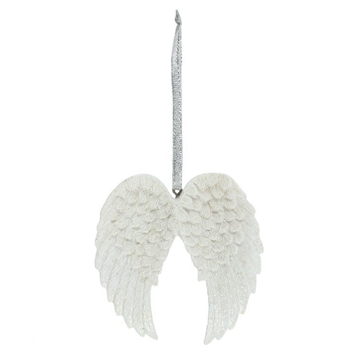 This pretty white double angel wing decoration features iridescent glitter for a sparkly effect when caught in the light. The wing comes on a metallic silver ribbon ready for hanging.
