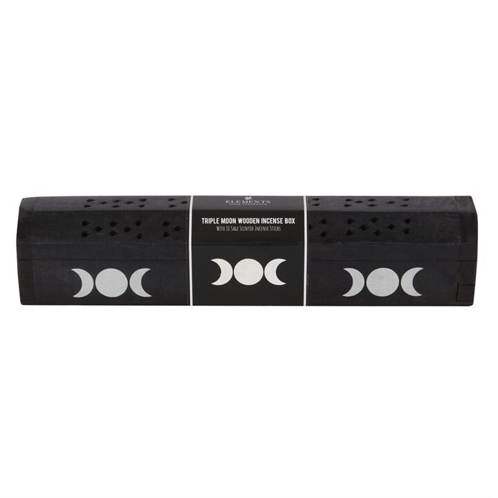 This incense gift set includes 10 sage fragranced incense sticks in a mango wood box. Printed with white triple moons, this box doubles as both an incense holder and storage. Designed by Something Different for Elements Home Fragrance.